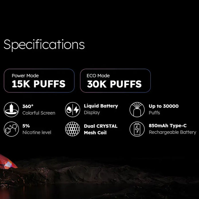 - Puff count: Up to 30,000 puffs (ECO Mode) / 1,500 puffs (Power Mode)