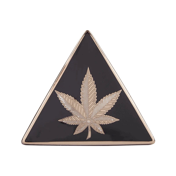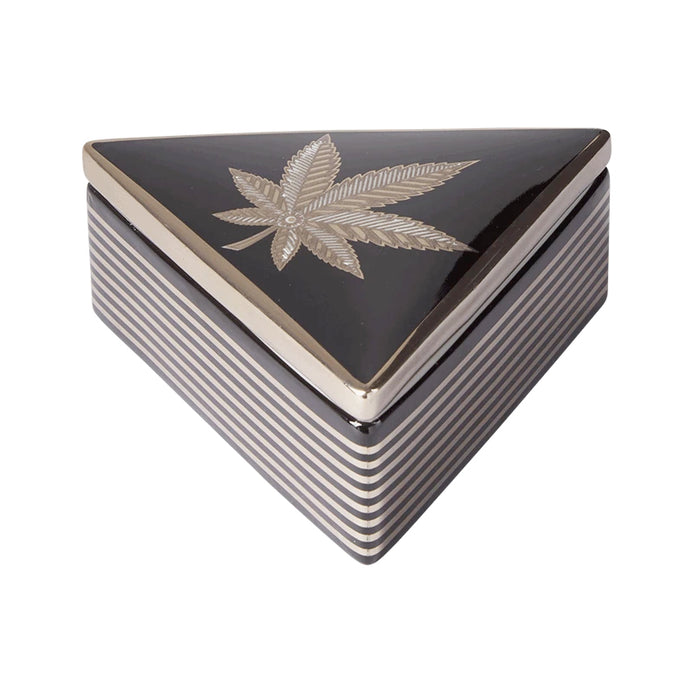 The Hashish Triangle Box features a black base colour and platinum lines that cut around all three corners. For added security and discretion, the Hashish Triangle Box is equipped with a porcelain lid that highlights a textured platinum leaf motif; easily removable, the lid can be used as a tray when flipped over. Crafted with raised inner edges, this convenient box makes ashing a quick and mess-free experience.