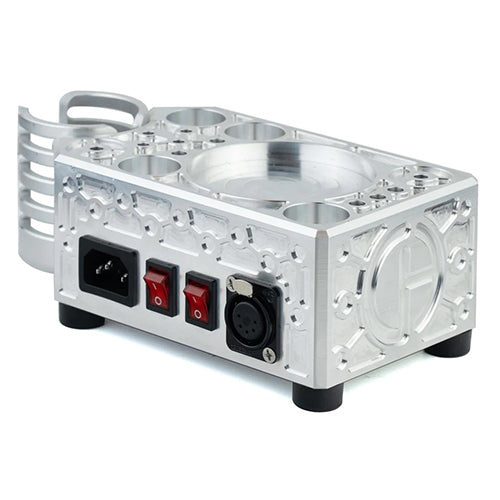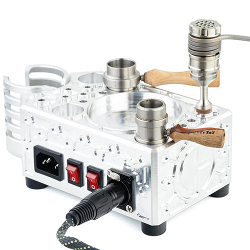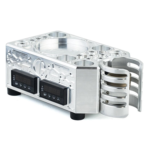 The Bliss also dual PID temperature controllers managed by separate power switches.  The device comes ready to use with a 25mm axial coil preinstalled, this means the coil will heat up from the bottom and the sides. For your comfort and safety the aluminum heat shield has two mounting positions which allows you to raise or lower for injector heads or tall bangers.  Conveniently located on the top of Bliss are 5 pockets: 1 (3") large pocket in the center for a grinder or AVB can, 4 medium size pockets for accessories such as your flower diffuser, carb cap, shovelhead, etc.  Also, located on top of the base are 8 holes for smaller accessories which be be used for dabbers, stirrers or loading tool. As well as 2 (1/4-20) threads for additional FlowerPot heat shields. Like rest of the collection Bliss is also made out top of the line 6061 aircraft aluminium.