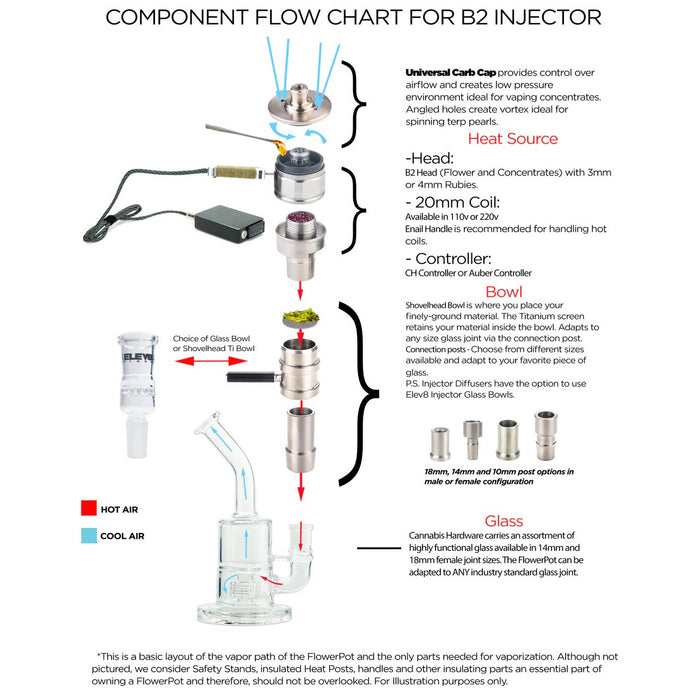 Everything you need and nothing you don't. If you have a Glass Rig, this bundle will get you vaping dry herbs and dabbing right away. The injector bundle includes a 14mm male connection post on the Elev8 injector style glass bowl to mate up to a 14mm piece. The FlowerPot B2 is the premiere desktop dual purpose vaporiser.