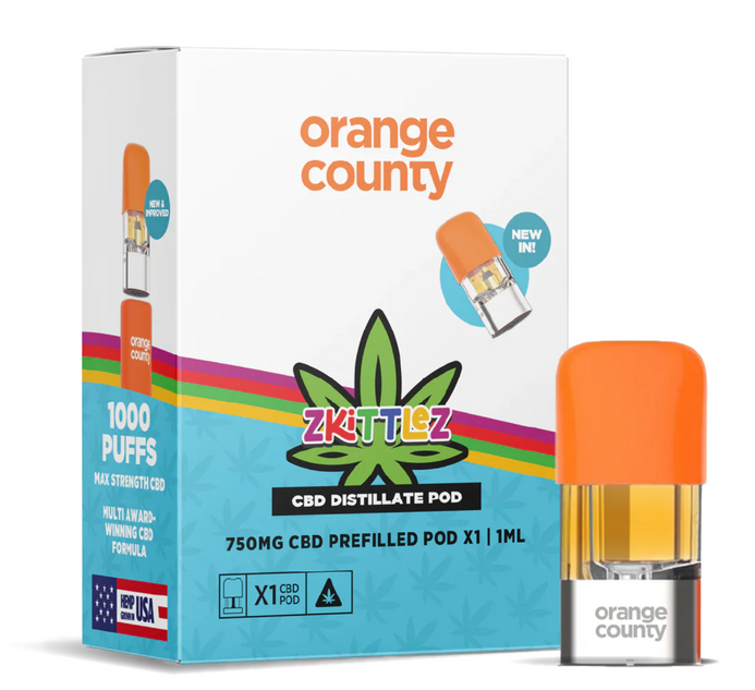 The Orange County CBD Distillate Refill Pod – Zkittlez delivers potent broad-spectrum CBD in a convenient 1ml refill pod format. Containing 750mg of CBD, this cartridge provides efficient dosing and smooth vapour in a compact, easy-to-use design.