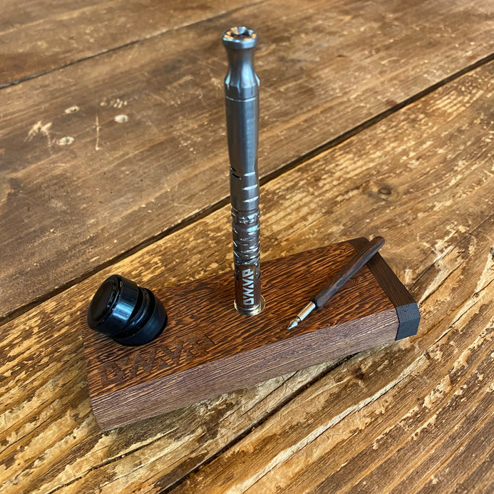 Store your XL or XLS length (109mm) DynaVap device in style with the DynaStash XL ER: Wenge. It is made from sustainably sourced wood to hold your device as well as dry material. The ER model also has a silicone container for added storage and comes with an extra storage compartment for a Stash Tool. It also includes an integrated magnet on the top to remove your hot Cap, hold your DynaVap vaporizer upright, and you can store the DynaStash by attaching it to any magnetic surface.