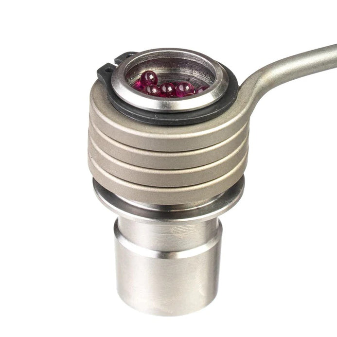 This device is bored through but it features two screen grooves to retain 3mm or 4mm ruby balls where the coil makes contact with the body. Efficient heating, Instant vapor.
