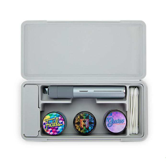 Keep your essentials organised with the Puffco Pivot Aluminium Travel Case. Designed with a durable ridged hard aluminium exterior, a magnetic lid closure, and a soft silicone interior to minimise rattling, this case is the ultimate travel companion. It has space for a Pivot + Hot Knife, up to three jars, cotton swabs, a covered section for waste, and anything else you may need on the go.
