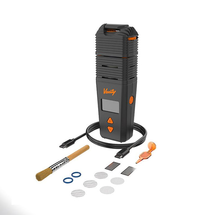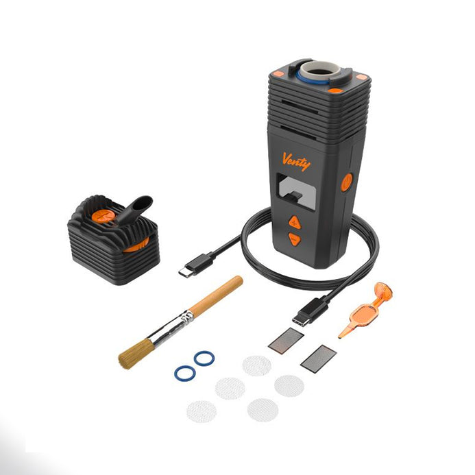 1 pc. VENTY 1 pc. USB-C Cable (USB type C to USB type C plug) 2 pcs. Normal Screen, small 3 pcs. Coarse Screen, small 2 pcs. Cooling Unit Screen 2 pcs. O-Ring Ø9x1,5 mm 1 pc. Filling Chamber Tool 1 pc. Cleaning Brush 1 pc. Instructions for Use (concise)