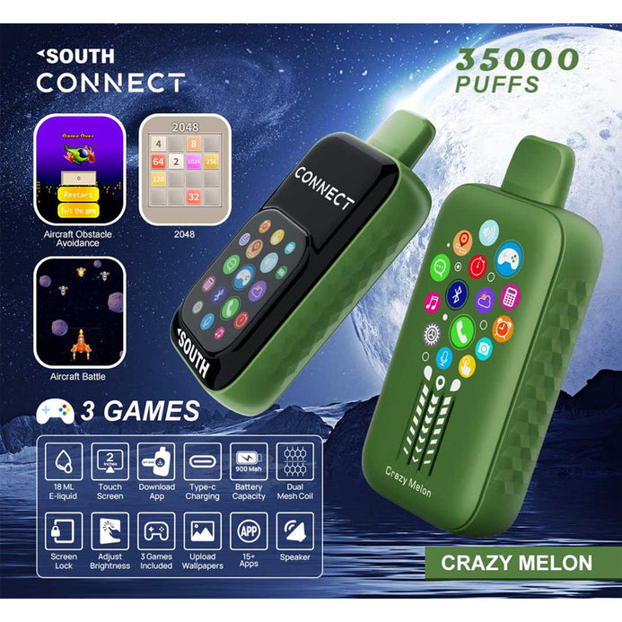 Meet the South Connect Rechargeable Pod Vape, a powerful next-generation device offering up to 35,000 puffs, a 900mAh rechargeable battery, and an entertainment-packed 2-inch full-touch screen. With Bluetooth connectivity, a downloadable companion app, built-in games, and custom wallpapers, this pod vape delivers both performance and personality.