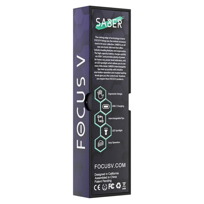 FOCUS V brings you the hottest accessory to hit your collection. SABER is an all new electronic dab tool that offers industry leading features and ergonomics. The high capacity battery charges quickly via USB-C and provides plenty of power for extended use. Equipped with 3 Power levels, an LED spotlight which allows you to see every little detail, and interchangeable tips which heat up quickly, SABER's intuitive one-button operation and multiple heating levels give you the control and freedom you expect from FOCUS V.