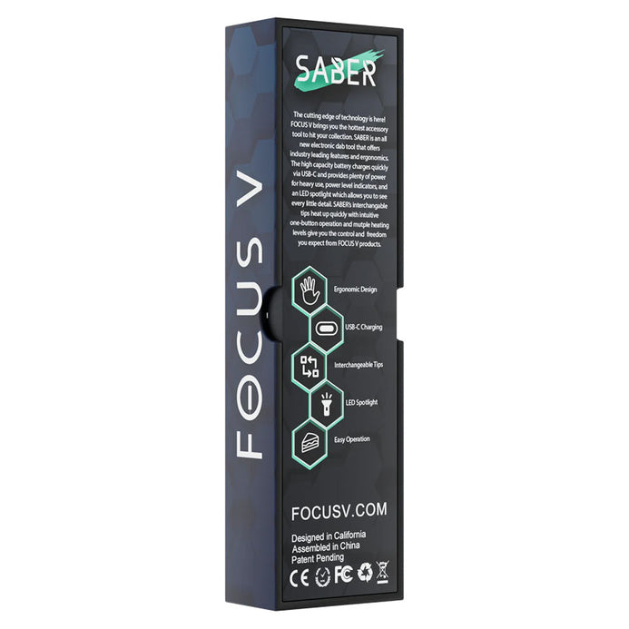 FOCUS V brings you the hottest accessory to hit your collection. SABER is an all new electronic dab tool that offers industry leading features and ergonomics. The high capacity battery charges quickly via USB-C and provides plenty of power for extended use. Equipped with 3 Power levels, an LED spotlight which allows you to see every little detail, and interchangeable tips which heat up quickly, SABER's intuitive one-button operation and multiple heating levels give you the control and freedom you expect from FOCUS V.