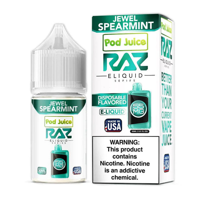 Check out Jewel Spearmint by Pod Juice Salts x RAZ – a smooth and refreshing spearmint nicotine salt blend that delivers a cool, crisp inhale with a touch of sweetness.