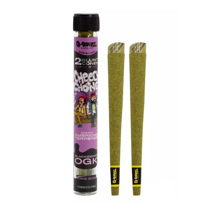 Enjoy the exclusive collaboration between G-Rollz and the iconic Cheech & Chong with this 2-pack of pre-rolled king-size blunt cones. Perfectly crafted from premium USA-grown hemp flower, these cones are infused with American-made 'canna' terpenes, delivering a mouthwatering Blackberry flavour and potent aromas.