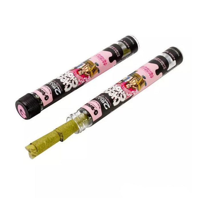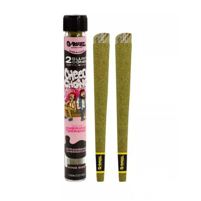 Enjoy the exclusive collaboration between G-Rollz and the iconic Cheech & Chong with this 2-pack of pre-rolled king-size blunt cones. Perfectly crafted from premium USA-grown hemp flower, these cones are infused with American-made 'canna' terpenes, delivering a mouthwatering Strawberry Cheesecake flavour and potent aromas.