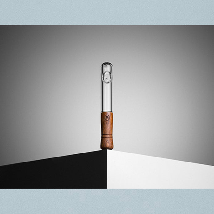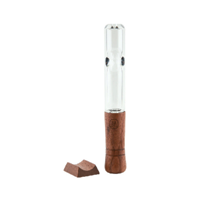 Heat-resistant hand-blown glass American Black Walnut Wood mouthpiece Curved design for easy handling Dimensions: 6.75″ L 1″ W