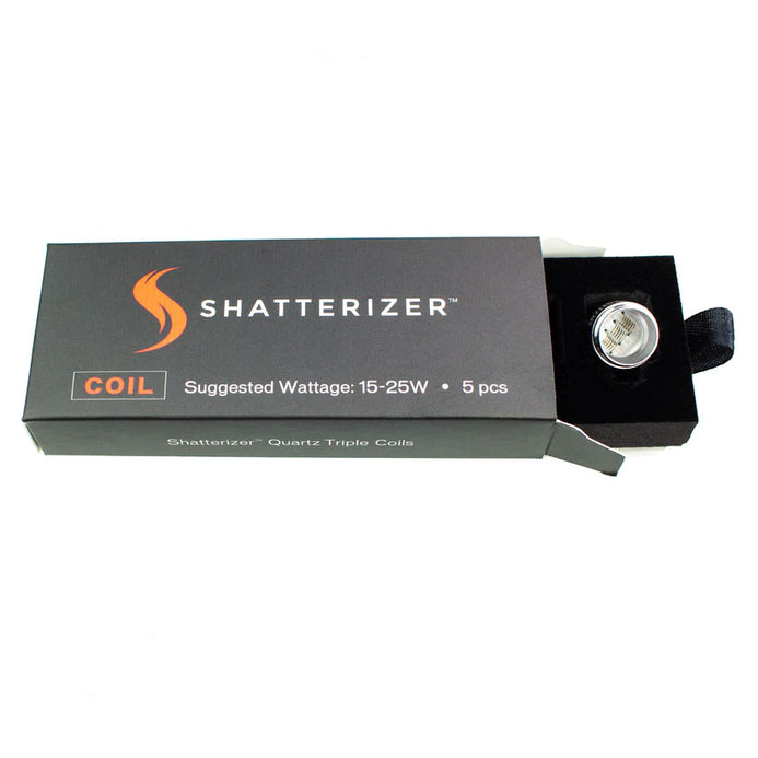 Compatible with All Shatterizer Vaporizers (Excluding DabTabs Top) Experience next-level performance with this official 5-pack of Shatterizer Quartz Triple Coils (QTC) – featuring three powerful quartz heating elements for larger loads, faster heat-up times, and massive, flavour-rich vapour.