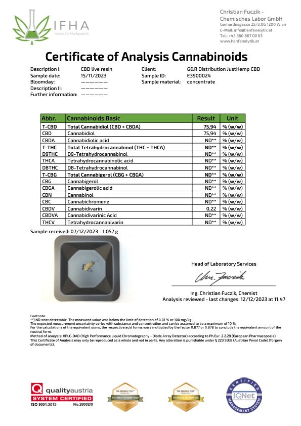 Total CBD (CBD + CBDA): 75.94% CBD (Cannabidiol): 75.94% CBDA (Cannabidiolic Acid): Not detectable CBDV (Cannabidivarin): 0.22% Non-detectable levels of THC (less than 0.03%).