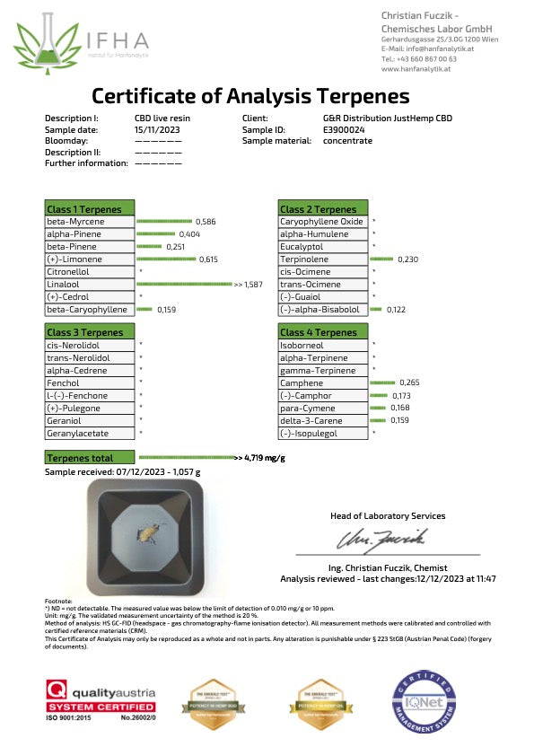 Total terpenes: 4.719 mg/g, providing a robust flavour and aroma.