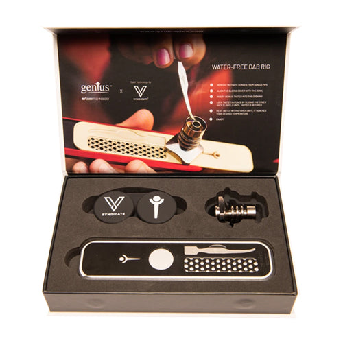 Elegantly packaged in a collector's worthy box, the Water-Free Dab Rig is about to change the world of dabbing. Genius Taster v.2, a Grinder Slider v.2 and two acrylic concentrate containers. The Water-Free Dab Rig doesn't need water to deliver an amazing experience and packs a powerful punch.