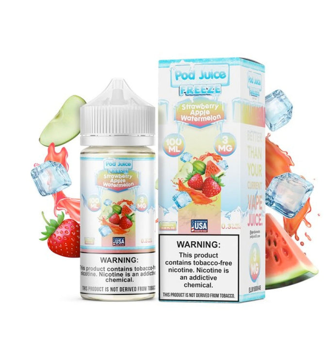 Beat the summer heat with POD Juice's Strawberry Apple Watermelon Freeze! Enjoy a blast of sweet strawberries, crisp apples, and succulent watermelon, coupled with an icy cool menthol that'll tantalize your taste buds and leave you feeling cool and refreshed.