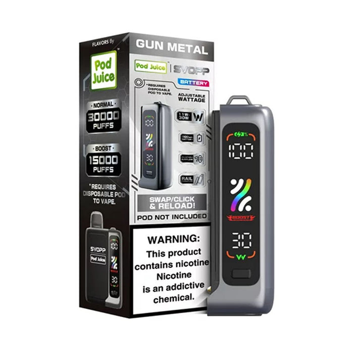 Power your vape with precision using the Pod Juice x SVOPP 1100mAh Rechargeable Battery. Built for performance and flexibility, this sleek device features a smart screen indicator to keep you informed of your wattage and battery level in real-time. The swap/click and reload system allows for seamless pod switching, delivering a smooth and efficient vaping experience.