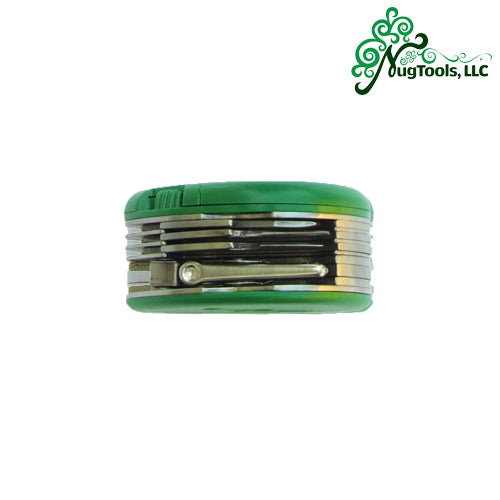 The designers have managed to fit 10 must have spring-locking tools into this super compact pocket size device including: a knife, scissors, a roach clip, a tamper, a mini spoon, a herb bowl scraper, a bottle opener, a flat head screwdriver, a pointed pick and an LED flashlight that offer 8 hours of continues battery life. The batteries are included with your purchase.