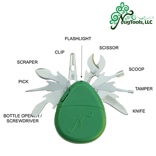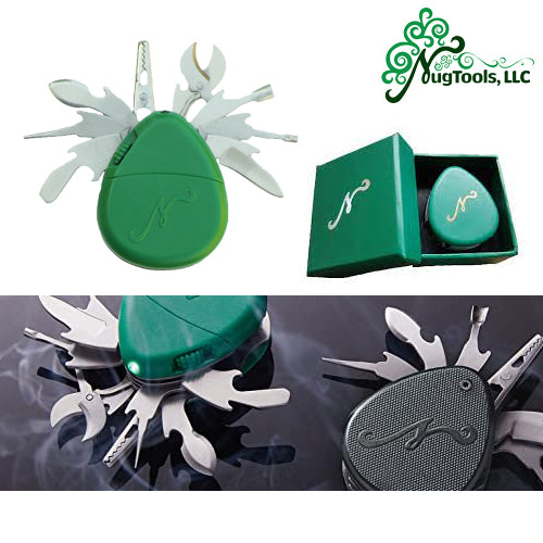 The Nuggy is a 10-in-One, pocket friendly multi-tool designed specifically for smokers. This Swiss Army style smokers survival tool has everything a real connoisseur could possibly need to help with rolling, cutting, shredding, dabbing, scraping, poking and vaping all packed into one durable unit.