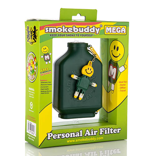 The Smokebuddy MEGA is Smokebuddy's largest personal air filter. Designed with a filter twice as large as the Original Smokebuddy. The flat shape fits in your hand and looks great. Every Smokebuddy MEGA includes a MEGA size Mr. MegaBuddy LED keychain that will light up when you squeeze him. Smokebuddy MEGA will last the heavy users months and possibly years. The Smokebuddy MEGA is a handy, and reliable, life saving air filter. Simply exhale your smoke through your easy-to-use Smokebuddy MEGA and odourless air comes out the other end. Smoke or vape where you want, and when you want without anyone knowing the wiser. Keep second hand smoke or vape away from friends, family, and neighbours with your Smokebuddy MEGA.