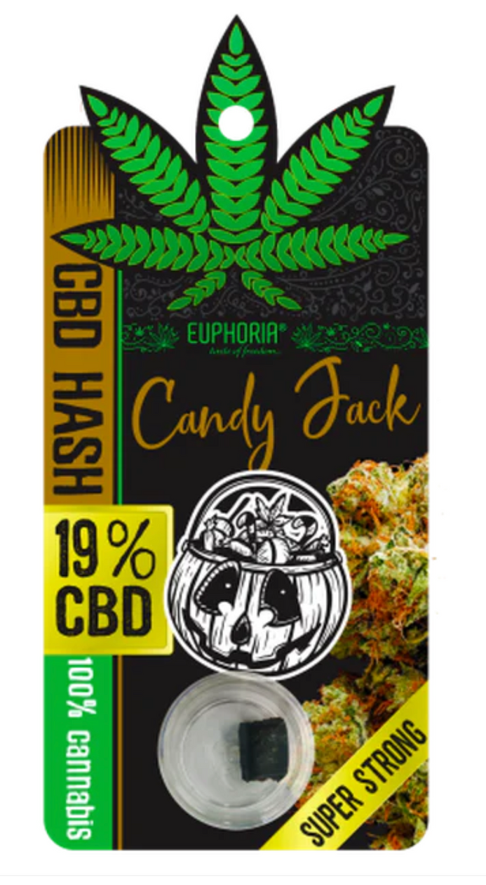 Euphoria Candy Jack CBD Hash is crafted from 100% pure Cannabis Sativa and enriched with 19% full-spectrum CBD extract and natural terpenes. Each 1g pot delivers a bold aromatic profile with sweet and earthy characteristics, offering a strong and refined fragrance experience.