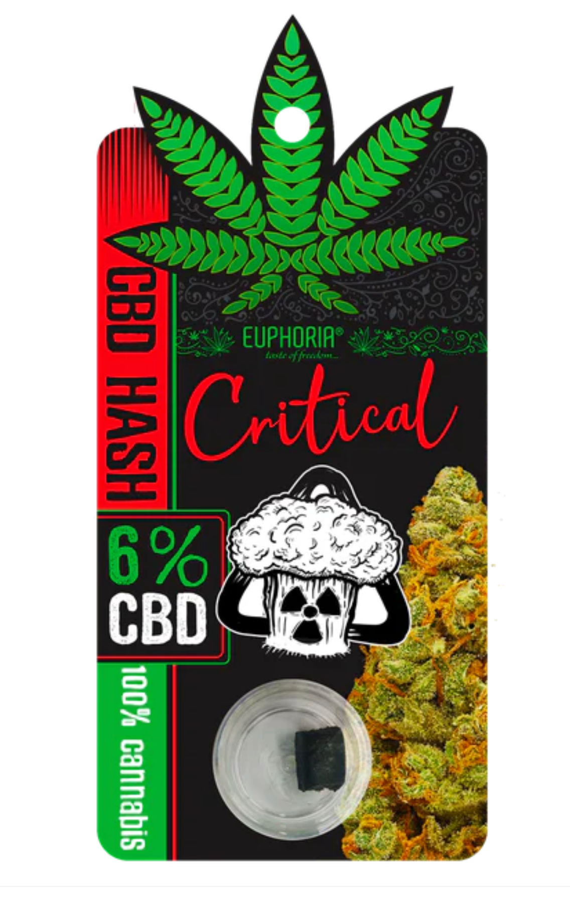 Euphoria Critical CBD Hash is crafted from 100% pure Cannabis Sativa and enriched with 6% full-spectrum CBD extract and natural terpenes. Each 1g pot delivers a classic hash-style aromatic profile with balanced earthy tones and subtle herbal sweetness.