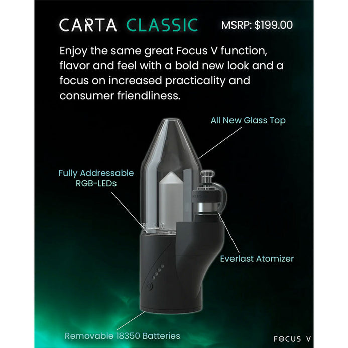 The first CARTA unit is back in black & better than ever. The first of more revamped OG color units to come, the Focus V CARTA Classic hits harda for less moola. Enjoy the same great Focus V function, flavor & feel with a focus on increased practicality and consumer friendliness.