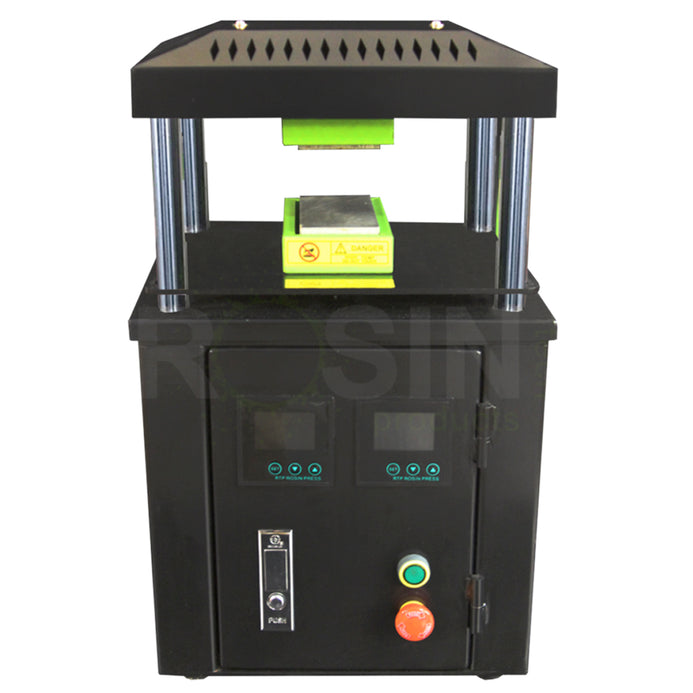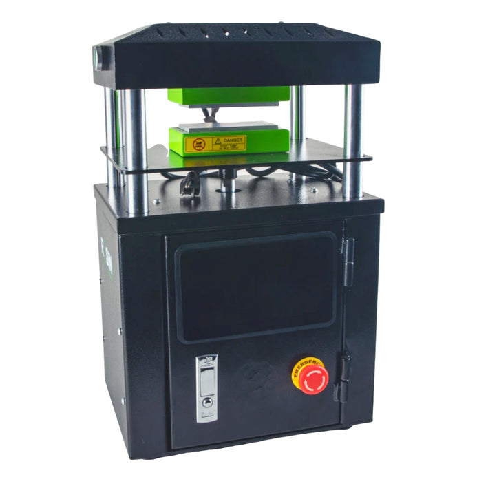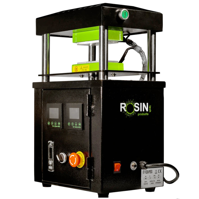 Rosin Tech All In One is a professional level rosin press that is great for dispensaries. This machine uses a closed loop hydraulic system to give 3 tons of pressure through its 2 3/8 by 4 3/8 inch aluminium plates. The best thing about a closed loop hydraulic system is it bypasses the need for an air compressor. It’s simple and quick to use just set the pressure, temperature, and length or press you want with the digital temperature and timer controller! This product also has some great safety features that will allow you to disengage instantaneously with its big red button. Another safety feature included is a dual hand control operation. Heating up to a temperature range of 0 to 415 F with its even heating micro processor temperature gauge it is the best piece of kit to create the perfect product time and time again with help with it’s built in digital auto timer and digital counter which tracks the number of presses per session. This product is perfect for stamping or developing different techniques. This model allows you to pick between automatic or manual speed control by simply a switch of the dial (left for manual, right for automatic). With the manual speed control it will allow you to fully control the lifting and dropping of the plates.